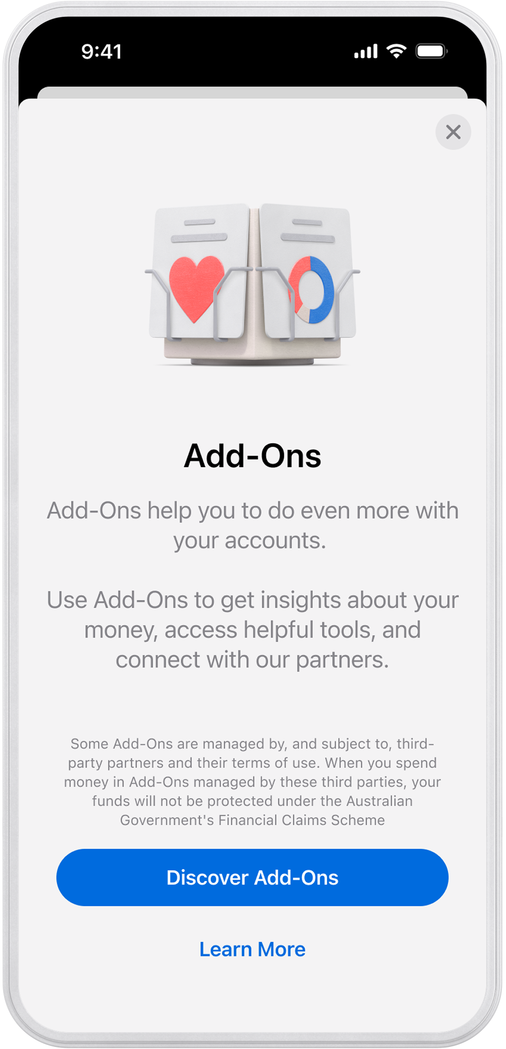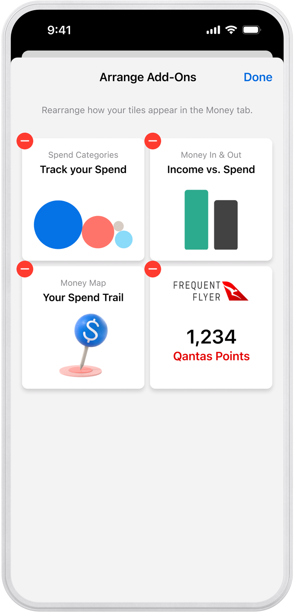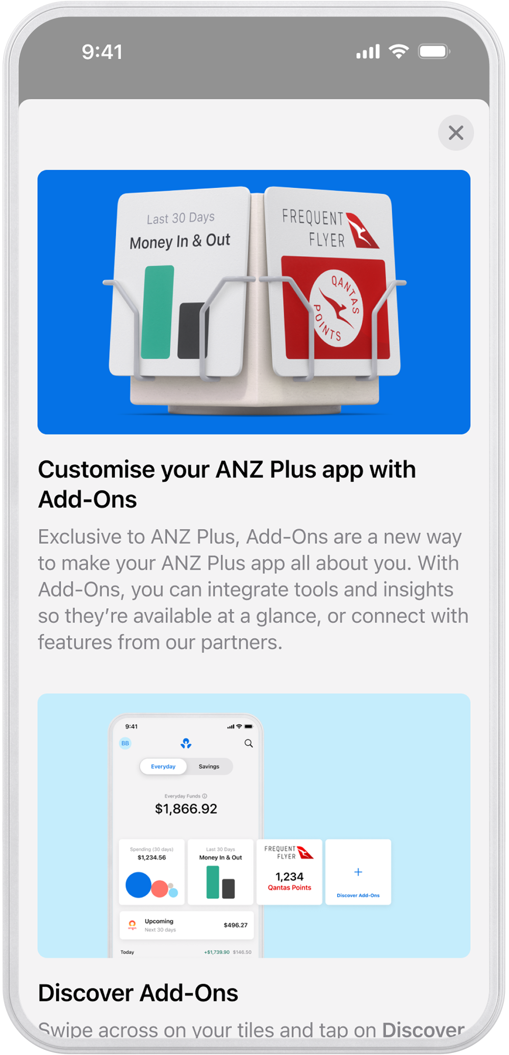 Add-Ons allowed customers to customise their ANZ Plus app with handy financial tools we built in house and integrations from our partners, including Qantas Frequent Flyer, ATM Finder, Money Map, Spend Categories and more.