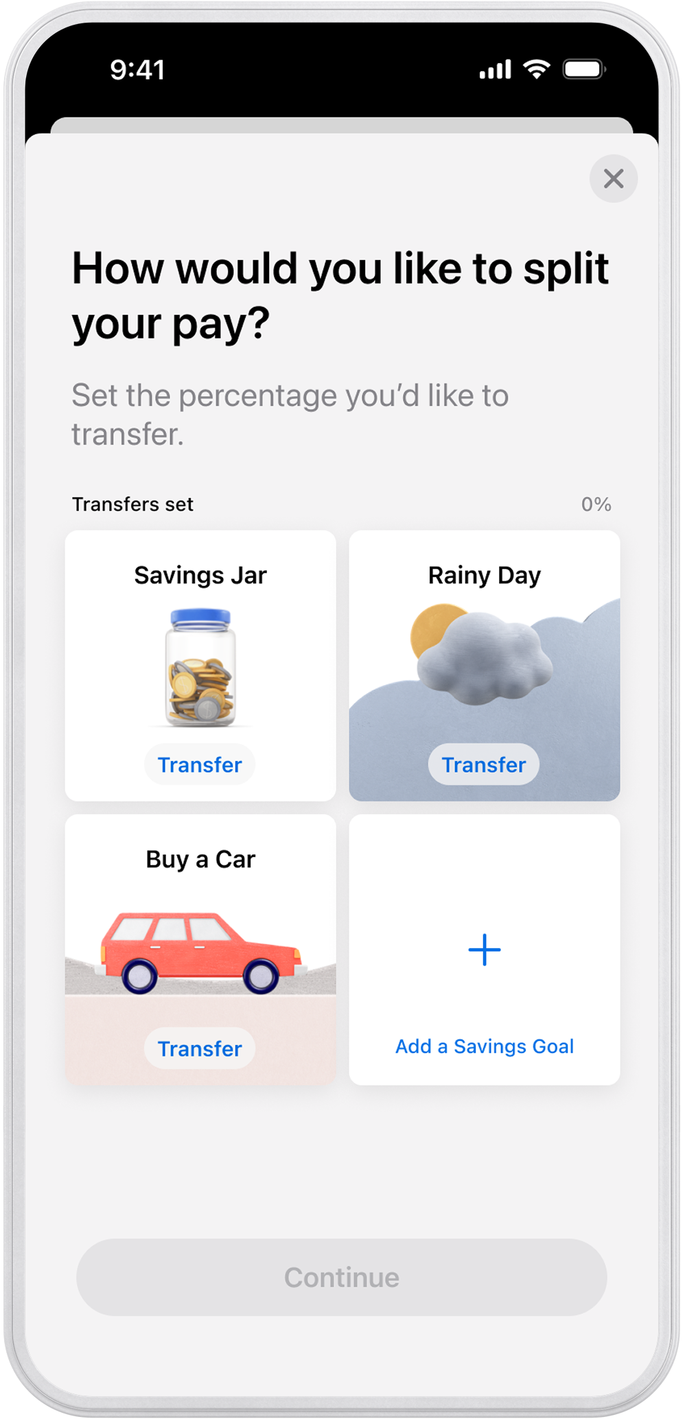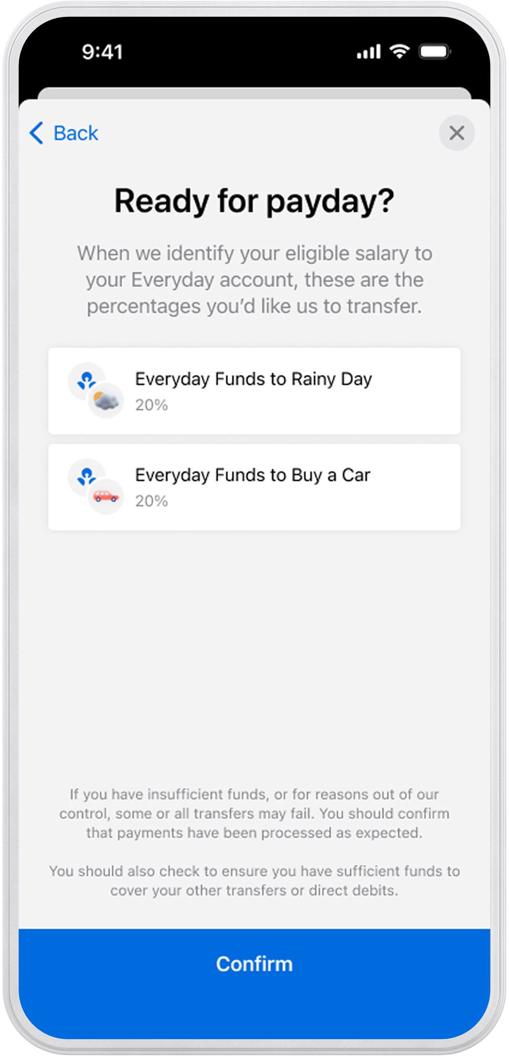 "When I get paid, transfer this percentage or that amount to..." is the simple logic of Payday Rules. Scheduled transfers triggered when your pay arrives – in whatever format makes sense for you.